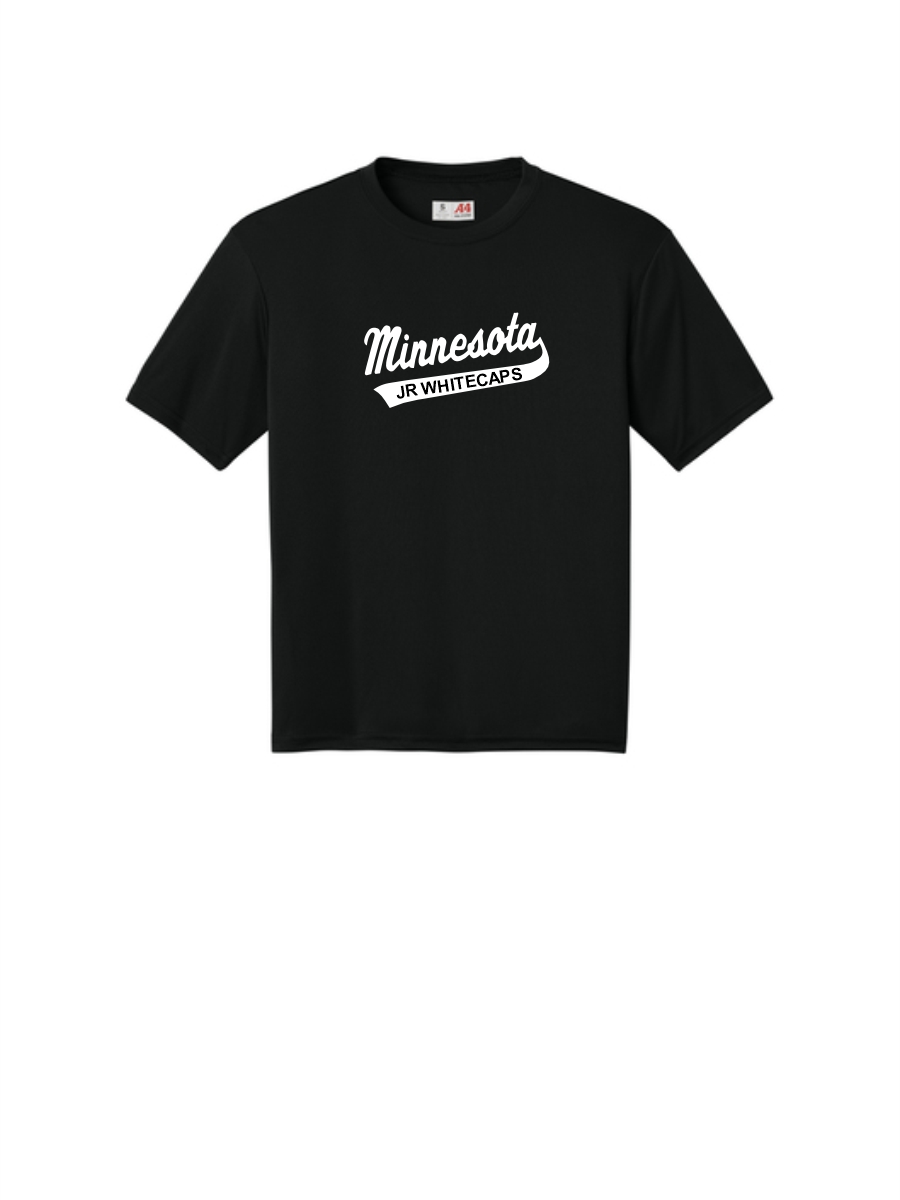 Black short sleeve performance tee with center chest MN Jr Whitecaps print