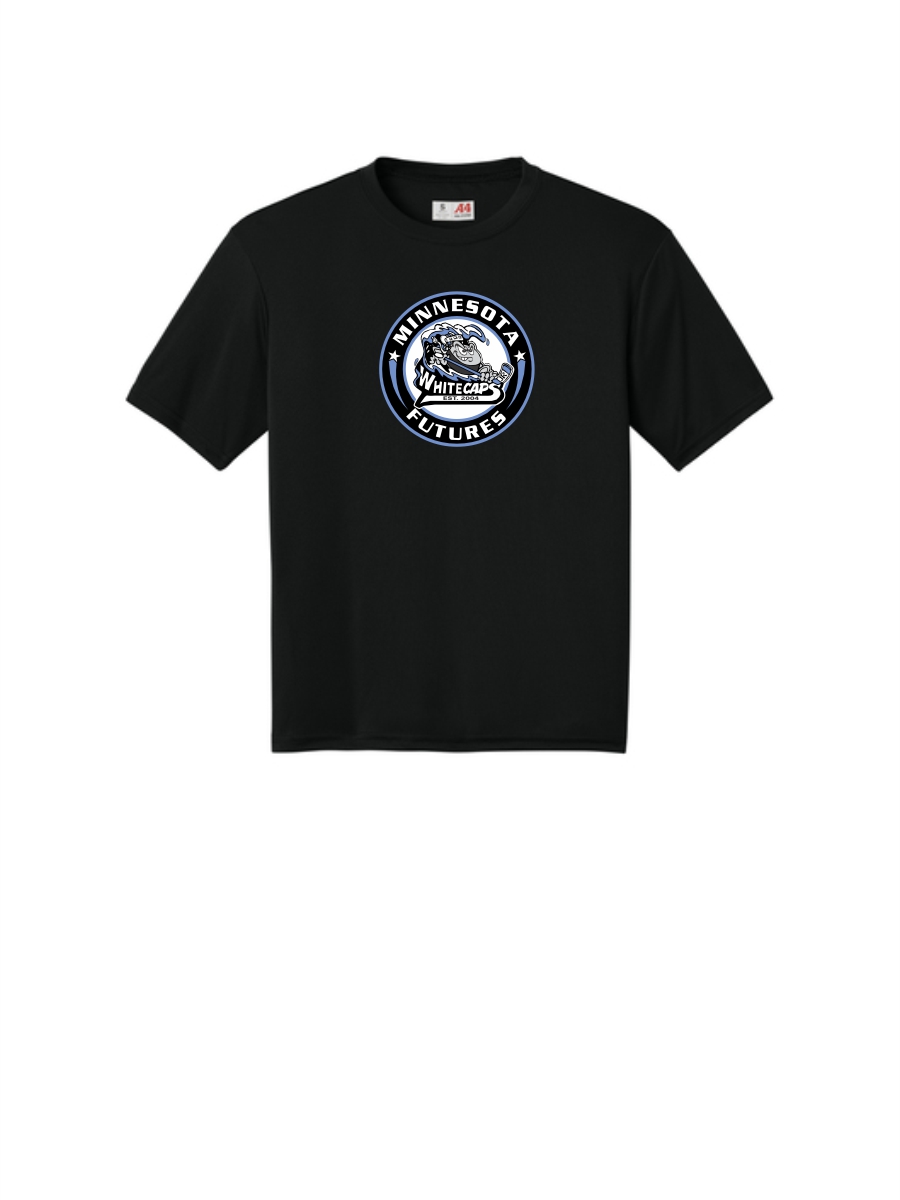 Black short sleeve performance tee with center chest MN Whitecaps Futures print