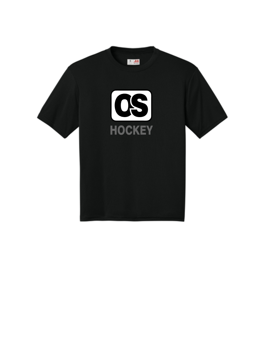 Black short sleeve performance tee with center chest OS Hockey General print