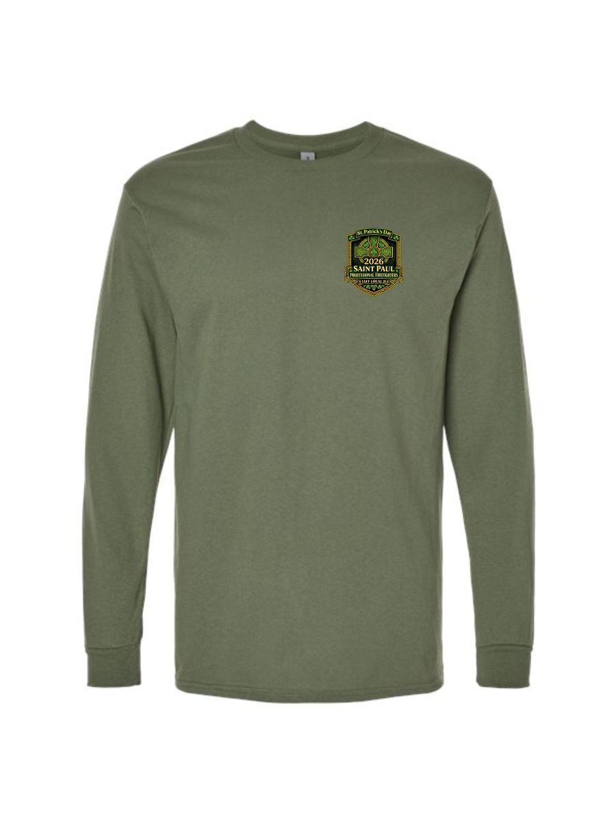 Military Green long sleeve tee with left chest print, and full back print