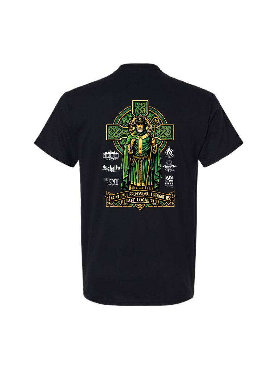 Black short sleeve tee with left chest print, and full back print.